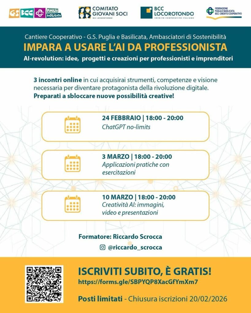 In un’epoca in cui l’AI sta ridefinendo le competenze richieste dal mercato del lavoro, questo corso rappresenta un’occasione unica per acquisire strumenti concreti e competenze immediatamente spendibili. Non si tratta di teoria astratta, ma di applicazioni pratiche che possono fare la differenza nel lavoro quotidiano.
