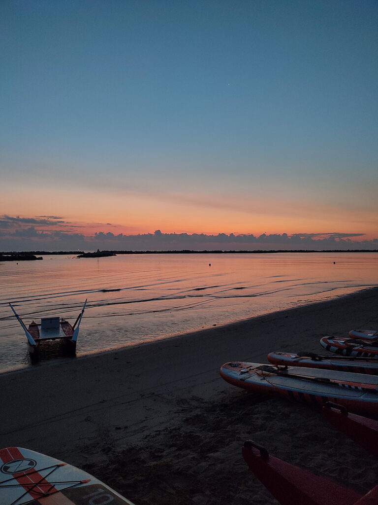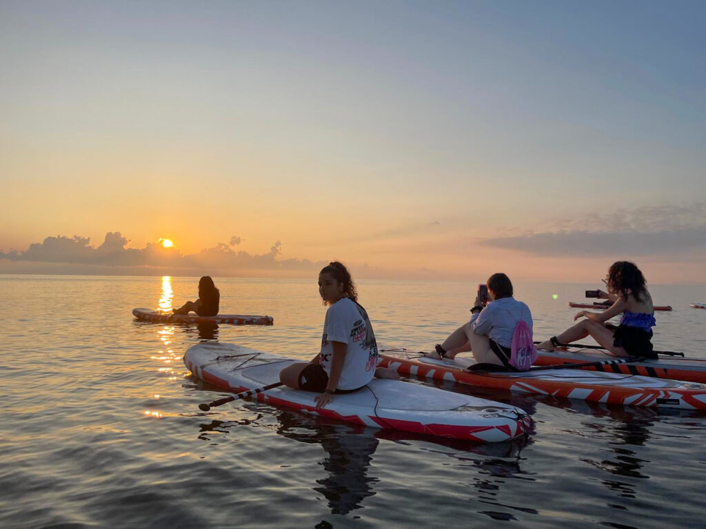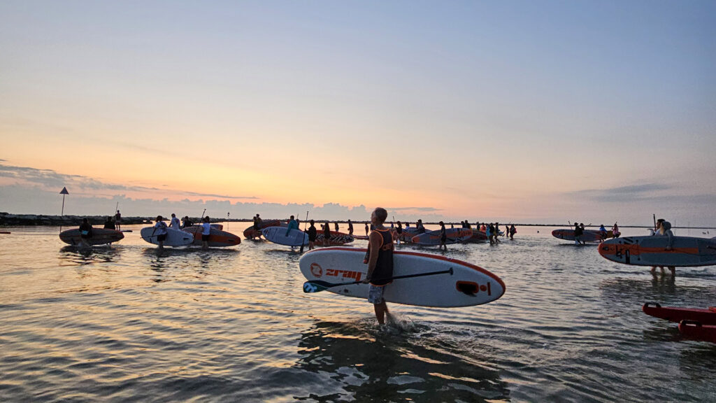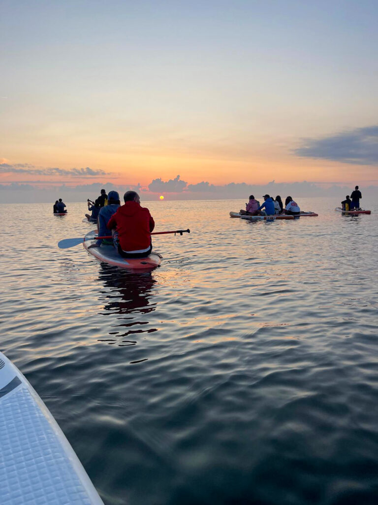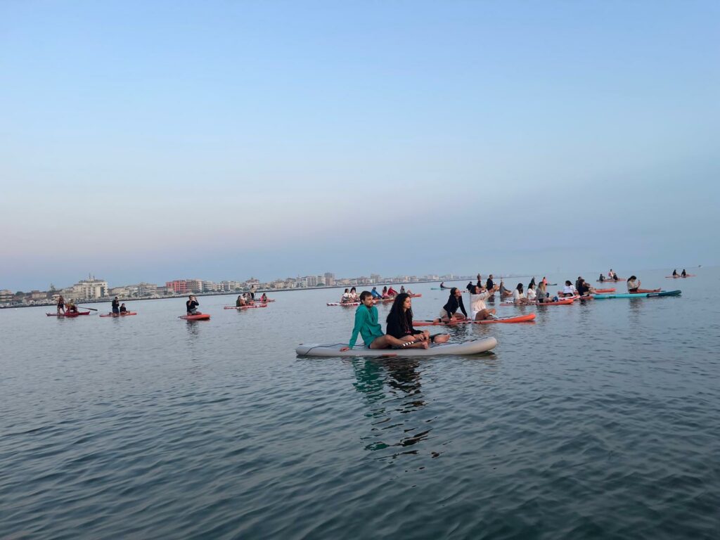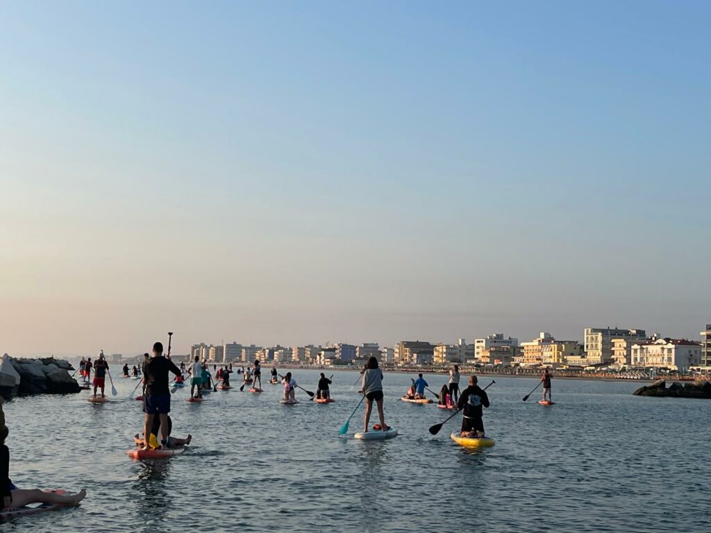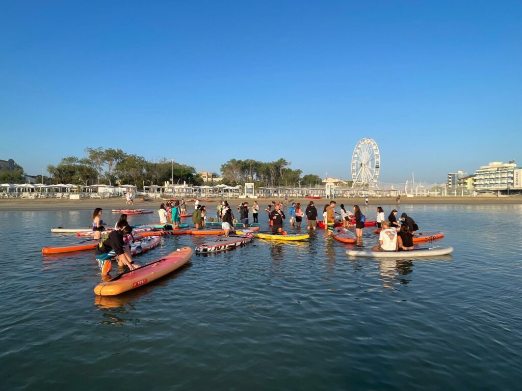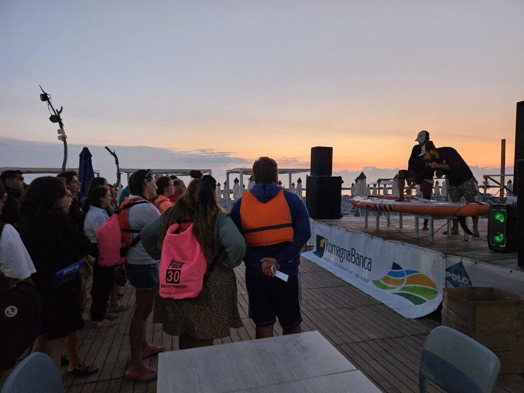 Partner tecnici di questa esperienza sono stati: Romagna Puddle Surf che ha fornito le tavole da SUP, gli istruttori e servizio di salvataggio e il Polo Est di Bellaria-Igea Marina per la colazione e il supporto logistico da terra.