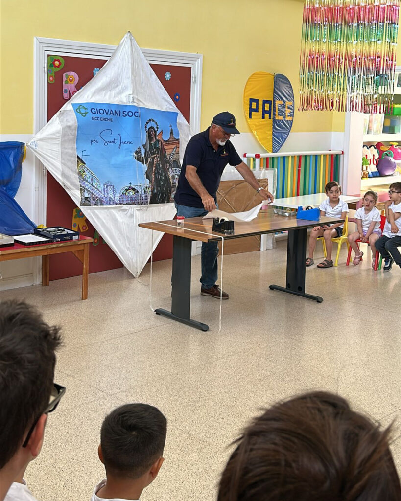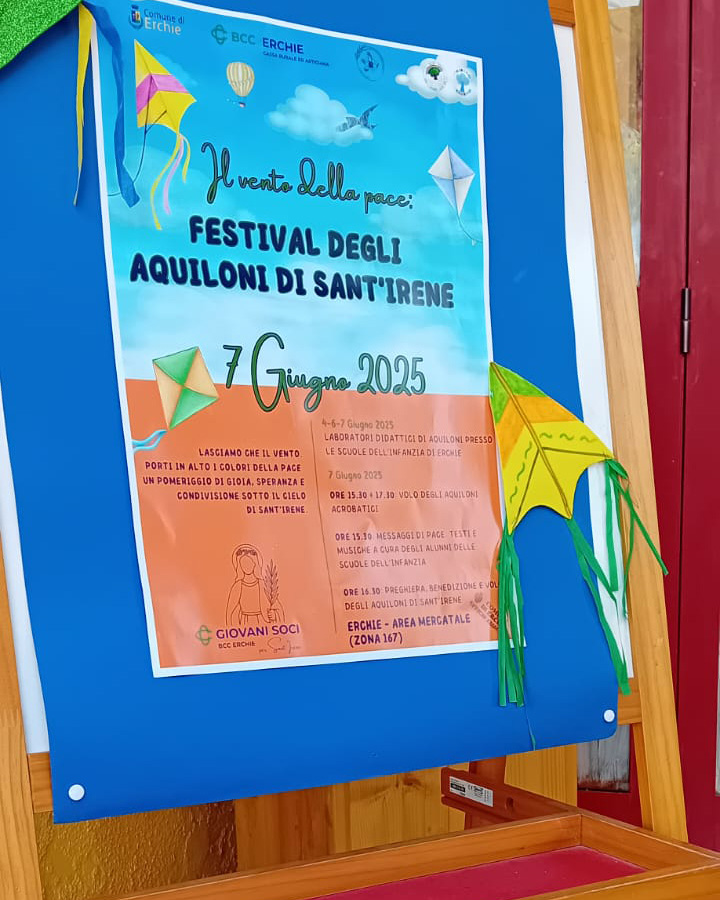 L’idea è venuta da Antonio dell’Aquila, presidente del Gruppo Giovani Soci BCC Erchie, che ha conosciuto la persona che da sempre si occupa del Festival degli aquiloni di Sant’Irene ed ha avviato questa collaborazione iniziata proprio con la realizzazione degli aquiloni. Sono infatti i bambini degli istituti scolastici della prima infanzia gli artefici degli aquiloni che volano sul cielo di Erchie in questa occasione. Tre giorni di laboratorio e creatività ed ogni bambino ha realizzato il proprio aquilone. Le maestre hanno preparato con loro anche canti, balli e poesie da mostrare durante la festa che si è svolta il 7 giugno scorso.