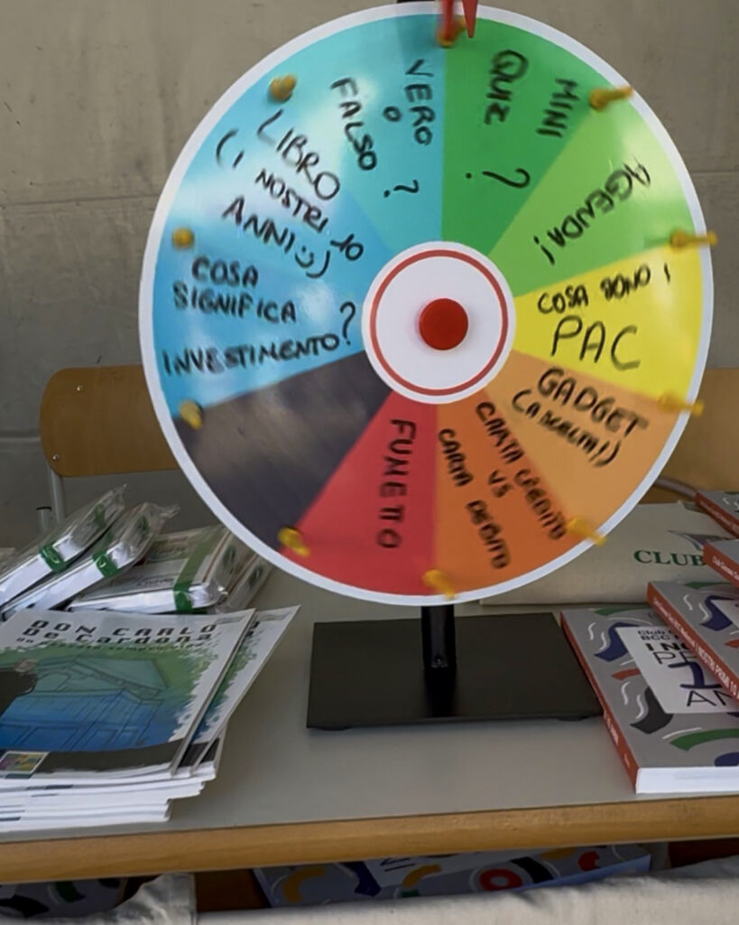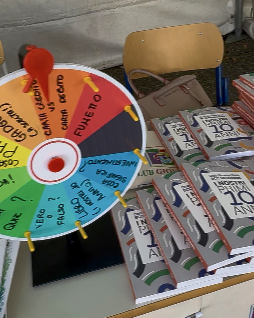• La Ruota Finanziaria: una vera e propria “ruota della fortuna”, rivisitata in chiave educativa. I partecipanti si sono messi alla prova con domande a risposta breve su temi come la differenza tra carta di credito e carta di debito, il significato di PAC, cosa vuol dire investire, e molto altro.